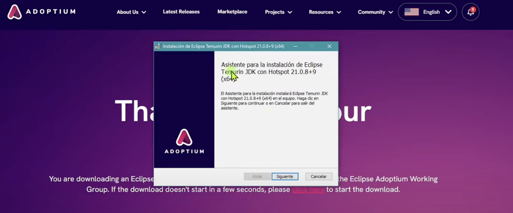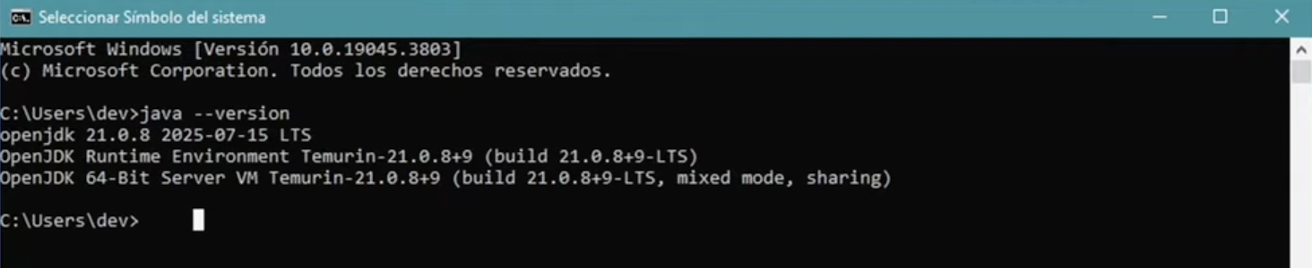 Si todo quedó bien, verás algo como openjdk 21.0.x junto al runtime y la VM. Si no reconoce el comando, abre una terminal nueva y verifica que %JAVA_HOME%\bin